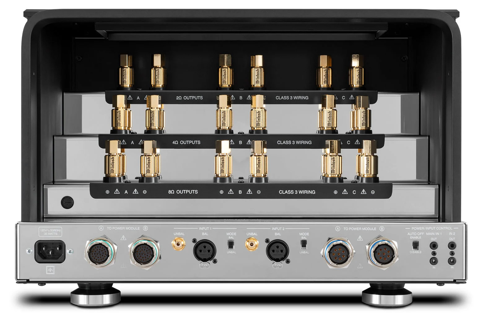 ●入力オーディオ信号はプリアンプから出力モジュールに入ります。同相信号は出力モジュールからいずれかのパワーモジュールに送信され、増幅されます。同時に、逆位相の信号がもう一方のパワーモジュールに送信され、増幅されます。 同時に、逆位相の信号がもう一方のパワーモジュールに送信され、増幅されます。両方の増幅された信号はパワーモジュールを出て、出力モジュールに再び入り、そこでバイファイラーに巻かれたMcIntosh Autoformer™の両端を駆動します。 これにより、ノイズが低減または完全にキャンセルされながら、2つのオーディオ信号が結合されて電力が合計されて1つに戻されます。 この巧みなエンジニアリングにより、低歪みのオーディオ信号が出力モジュールから出力され、スピーカーからサウンドが届けられます。