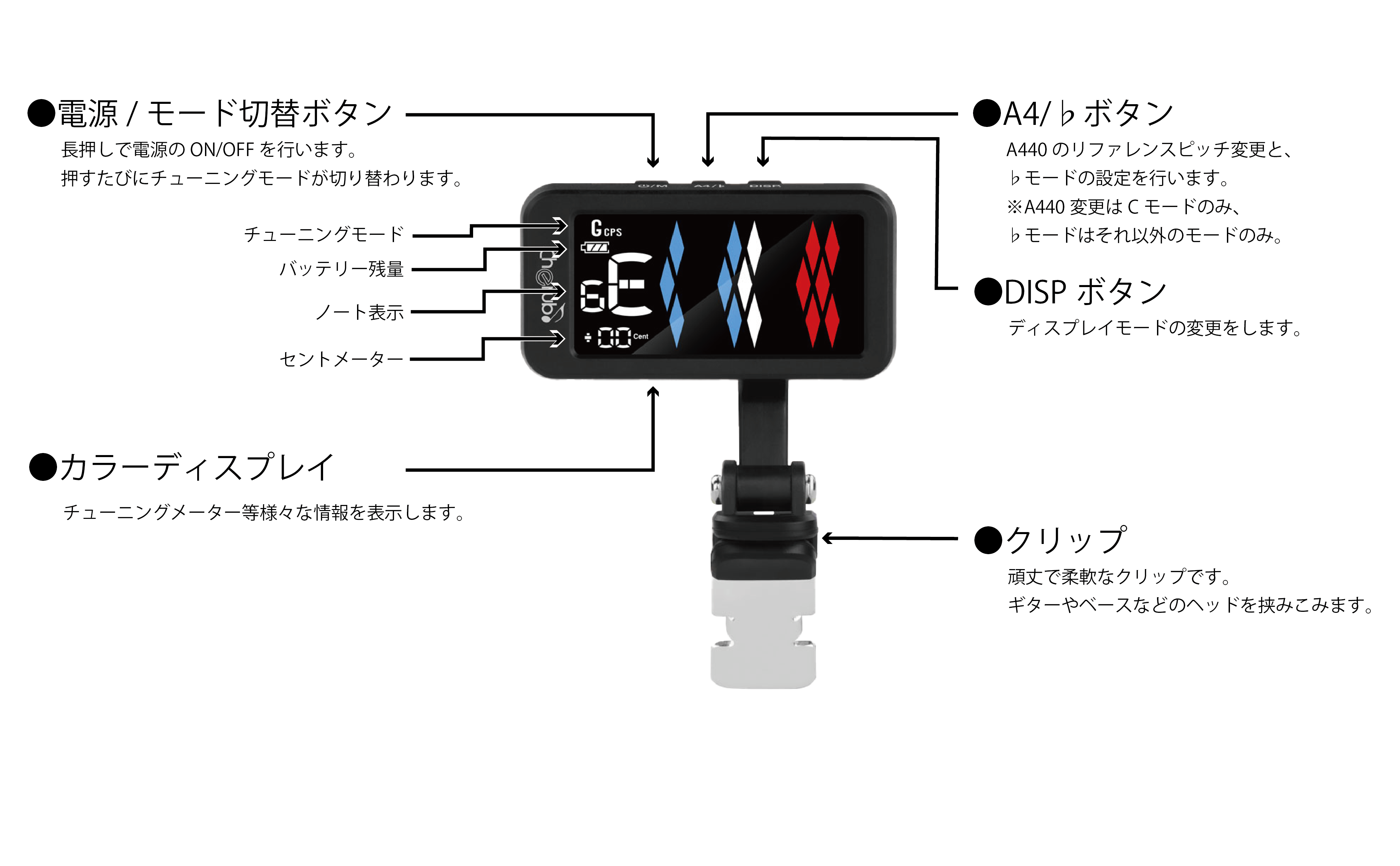 4つディスプレイモードとCPS*チューニングモードを含む5つのチューニングモードを搭載した充電式クリップチューナー