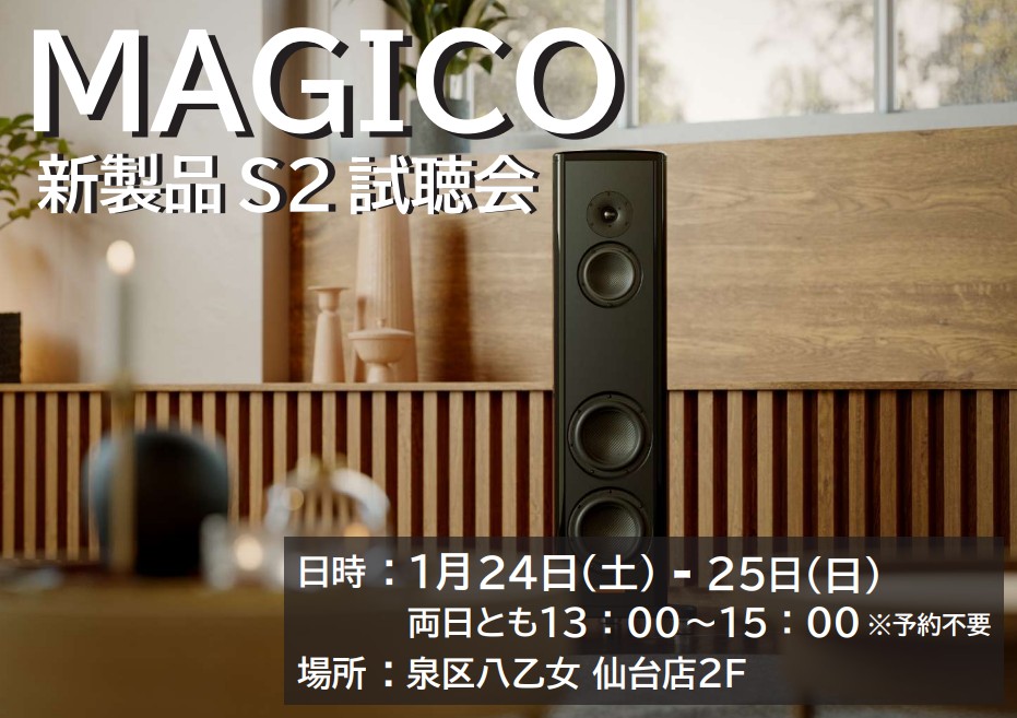 イベント情報 What's New 2026.1.23 EVENT のだや仙台店 MAGICO S2 新製品試聴会 Feel the Sound ■開催日時:2026年1月24日(土)~1月25日(日)13:00~15:00■開催場所:のだや仙台店2F 〒963-8871福島県郡山市本町1-3-8 ●詳しいイベント情報は<こちら>から 最新情報一覧に戻る
