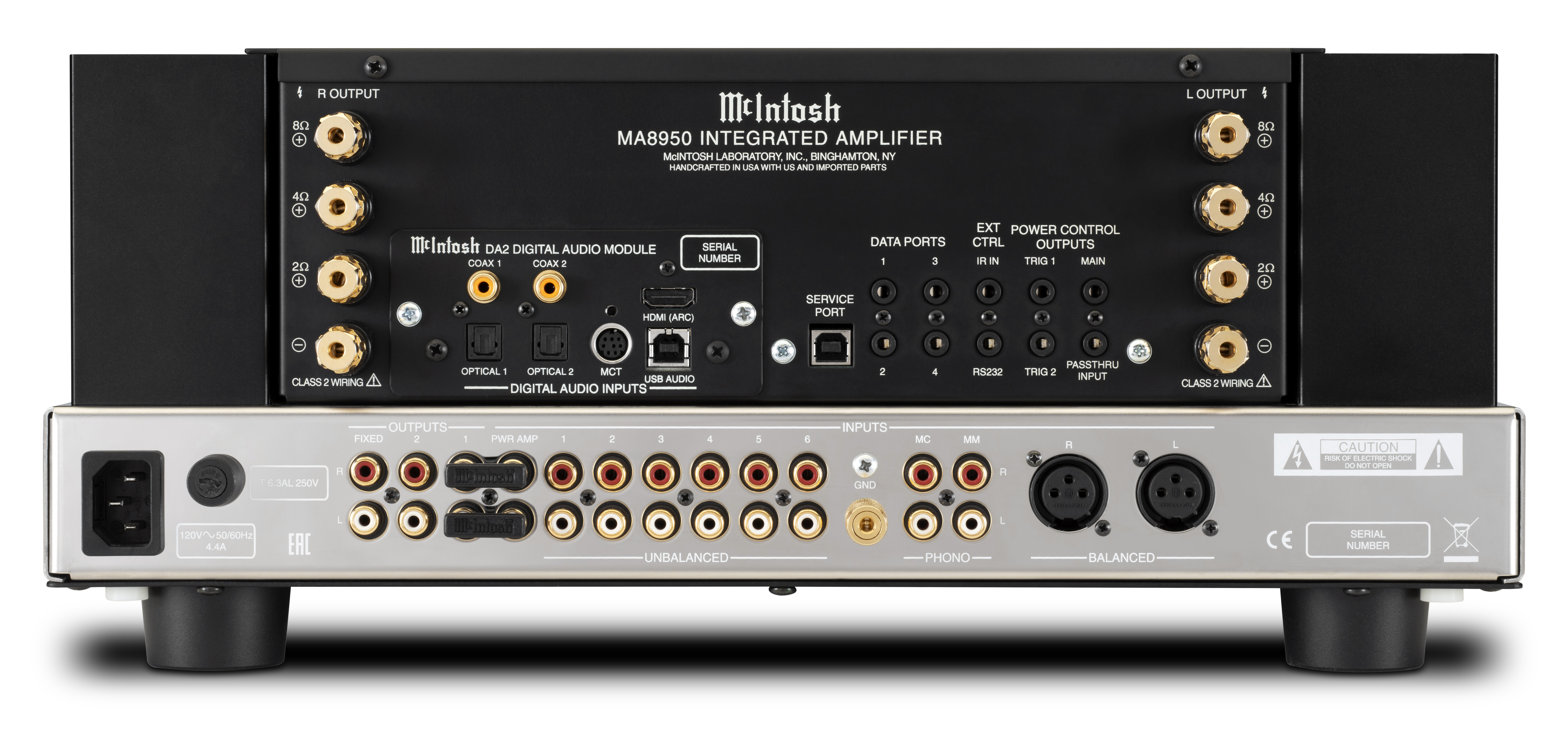 ●『MA8950』は、『MA8900』に搭載されていた「DA1デジタルオーディオモジュール」に代わり、「DA2デジタルオーディオモジュール」を標準搭載しています。DA2は、同軸2系統、光2系統、USB1系統、MCT1系統、音声専用のHDMI Audio Return Channe(l ARC)1系統の合計7系統のデジタル入力を備えています。対応するHDMI (ARC)出力を持つテレビを『MA8950』に接続することで、テレビのサウンドをMcIntoshを通して今までにない形で楽しむことができます。Dolby®やDTS®などの一般的なマルチチャンネルオーディオフォーマットに対応しており、2チャンネルオーディオに変換して再生することができます。アンプとテレビの両方でCEC通信が有効な場合、リモコンでテレビの電源や音量をコントロールすることができます。また、DA2はUSB入力によるDSD再生が最大DSD512まで対応するようになりました。