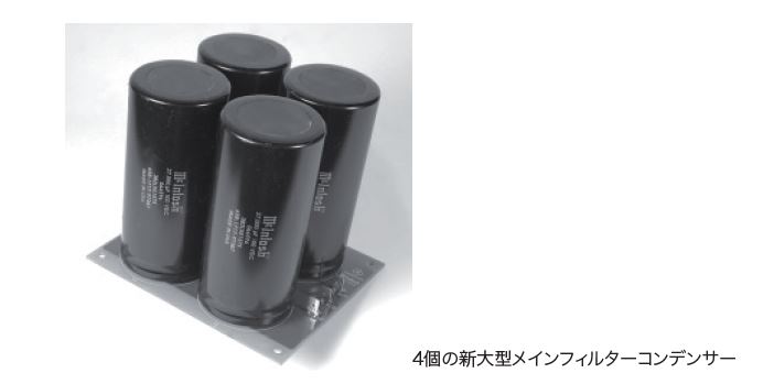 ●4個の大型メインフィルターコンデンサーは、デジタルオーディオ等が要求するワイドダイナミックレンジに対応するため、300ジュール以上のエネルギーを蓄えることができます(前モデルは、2個のコンデンサーで容量は、140ジュール)。フィルターコンデンサーの大型化は、ダイナミック・ヘッドルーム(定格出力を超える瞬間最大出力)を2.8dBに向上させました(前モデルのダイナミック・ヘッドルームは、1.8dB)。