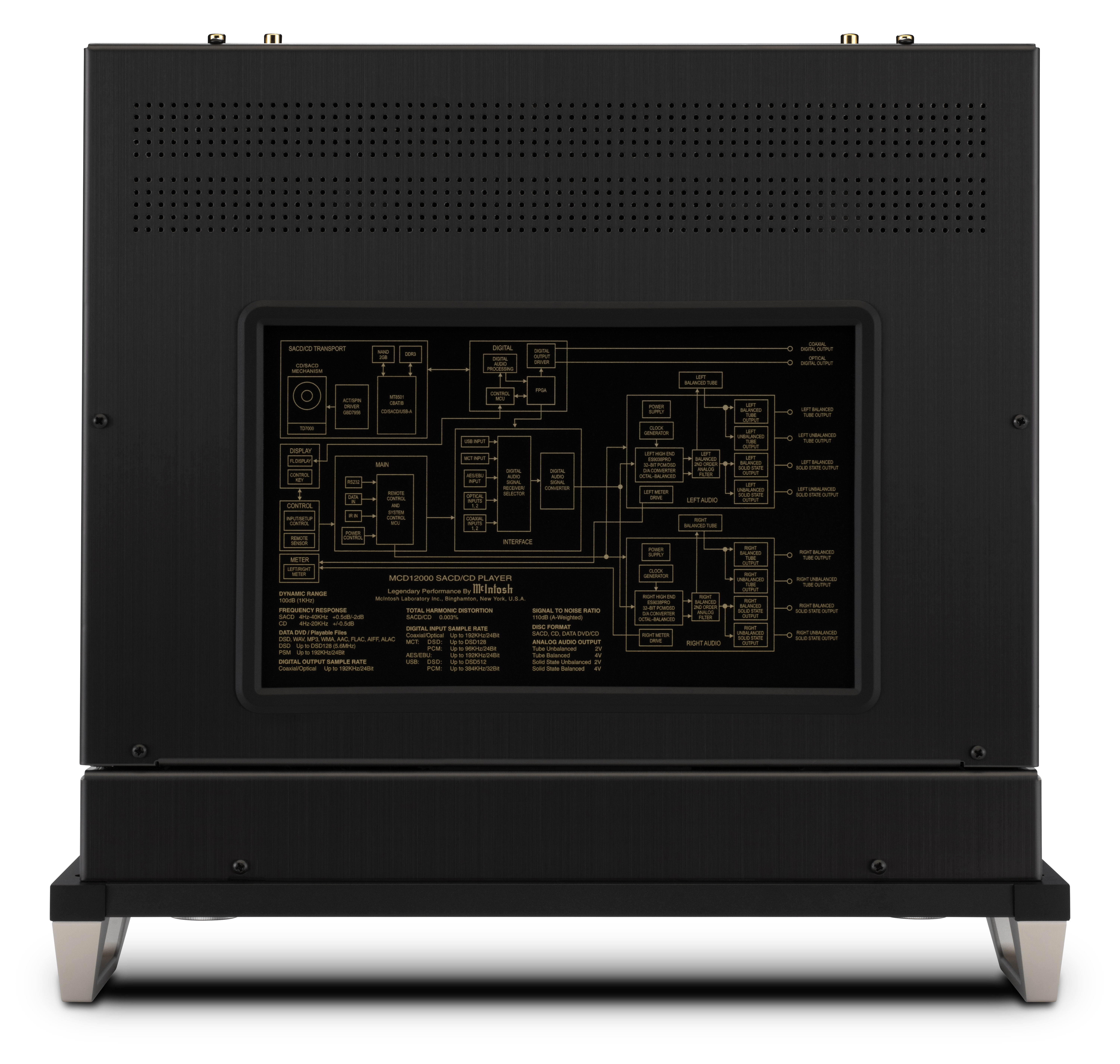 ●MCD12000は、マッキントッシュの伝統的なスタイリングに包まれています。筐体下部は鏡面仕上げのステンレススチール、上部は同じヘアライン仕上げのブラックチタニウムステンレススチールとなっており、ホームオーディオシステムに豊かさと洗練さをもたらしてくれます。正面には、ブラックガラスパネル、イルミネーションロゴ、ノブ、プッシュボタン、アルミ削り出しハンドルなど、伝統のマッキントッシュ製品と統一感のあるデザインを採用しています。上面には、性能仕様とオーディオ信号経路のブロックダイアグラムがガラスパネルに浮かび上がっています。