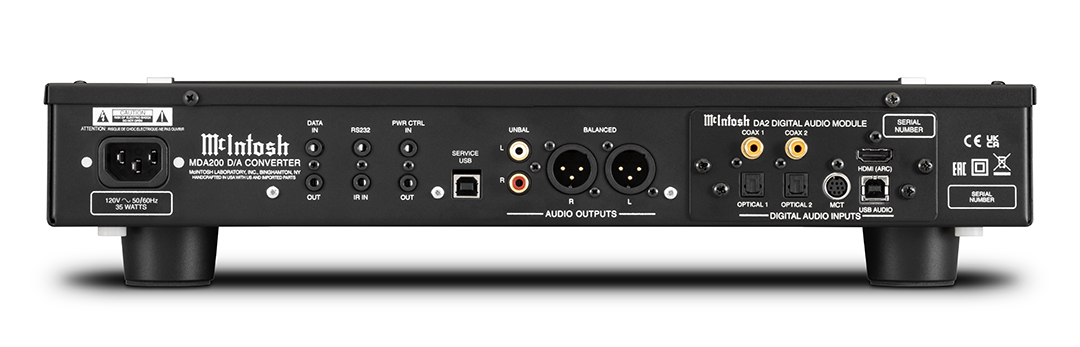 ●MDA200の心臓部には、McIntoshのデジタルオーディオモジュール「DA2」が搭載されています。DA2は、同軸2系統、光2系統、USB1系統、MCT1系統(McIntosh製のSACD/CDトランスポートMCTシリーズで使用)、オーディオ専用オーディオリターンチャンネル(ARC)1系統の合計7系統のデジタルオーディオ入力を搭載しています。