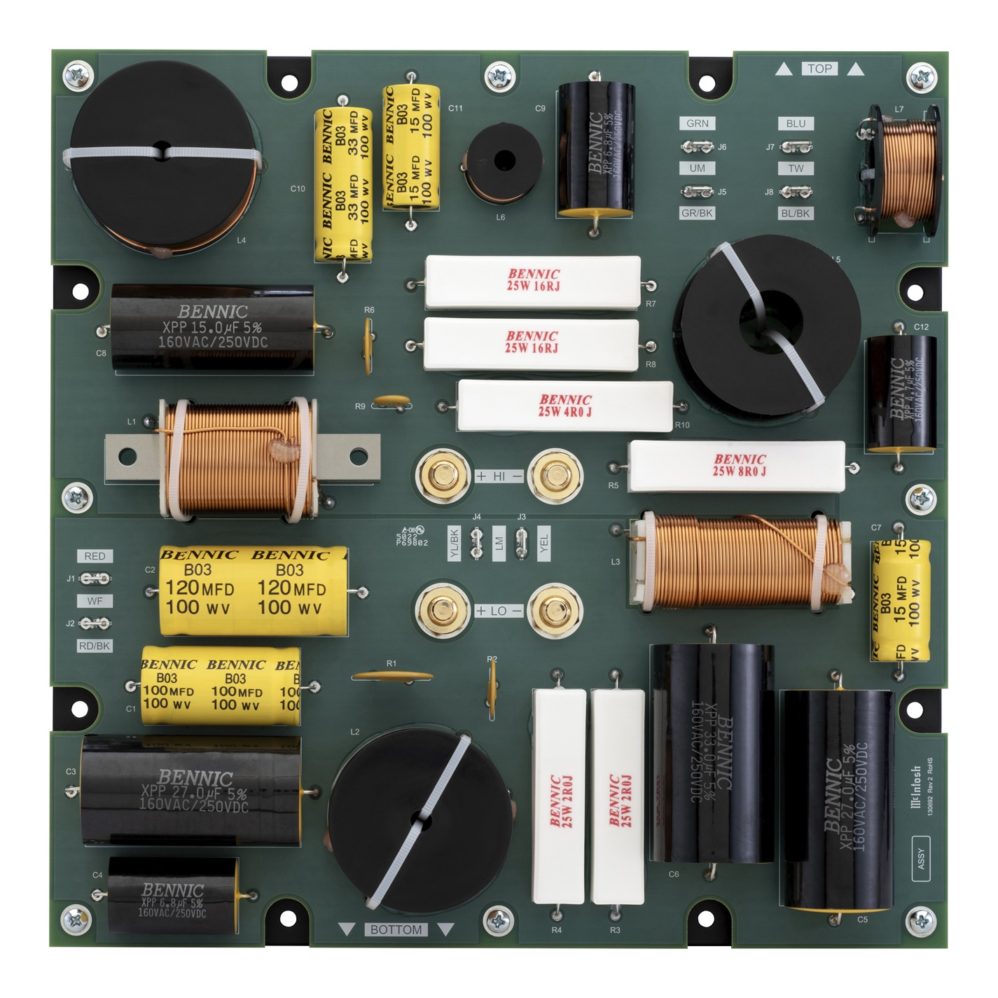 ML1 MkⅡは、パフォーマンスと耐久性を考慮してMcIntosh 社のエンジニアによって設計されたカスタム製のクロスオーバー・ネットワークを採用しています。オーバースペックのコンポーネントが高いパワーハンドリングを保証し、セルフリセット機能付きの保護回路がユニットの損傷を防ぎます。クロスオーバーの設計は、ローパスフィルターとハイパスフィルターを分離し、バイワイヤリングまたはバイアンプ接続できるようになっています。アンプからの音楽信号は、ソリッドシンチ™スピーカーバインディングポストを通してML1 MkⅡへ供給されます。このバインディングポストにより、スピーカーケーブルが緩んでショートを引き起こす可能性を防ぎます。バインディングポストには金メッキが施され、腐食を防ぎ、スピーカーケーブルを通じて高品質な信号が送られることを保証します。