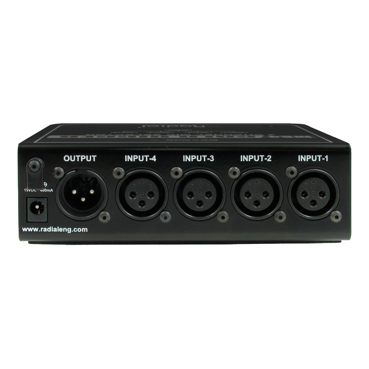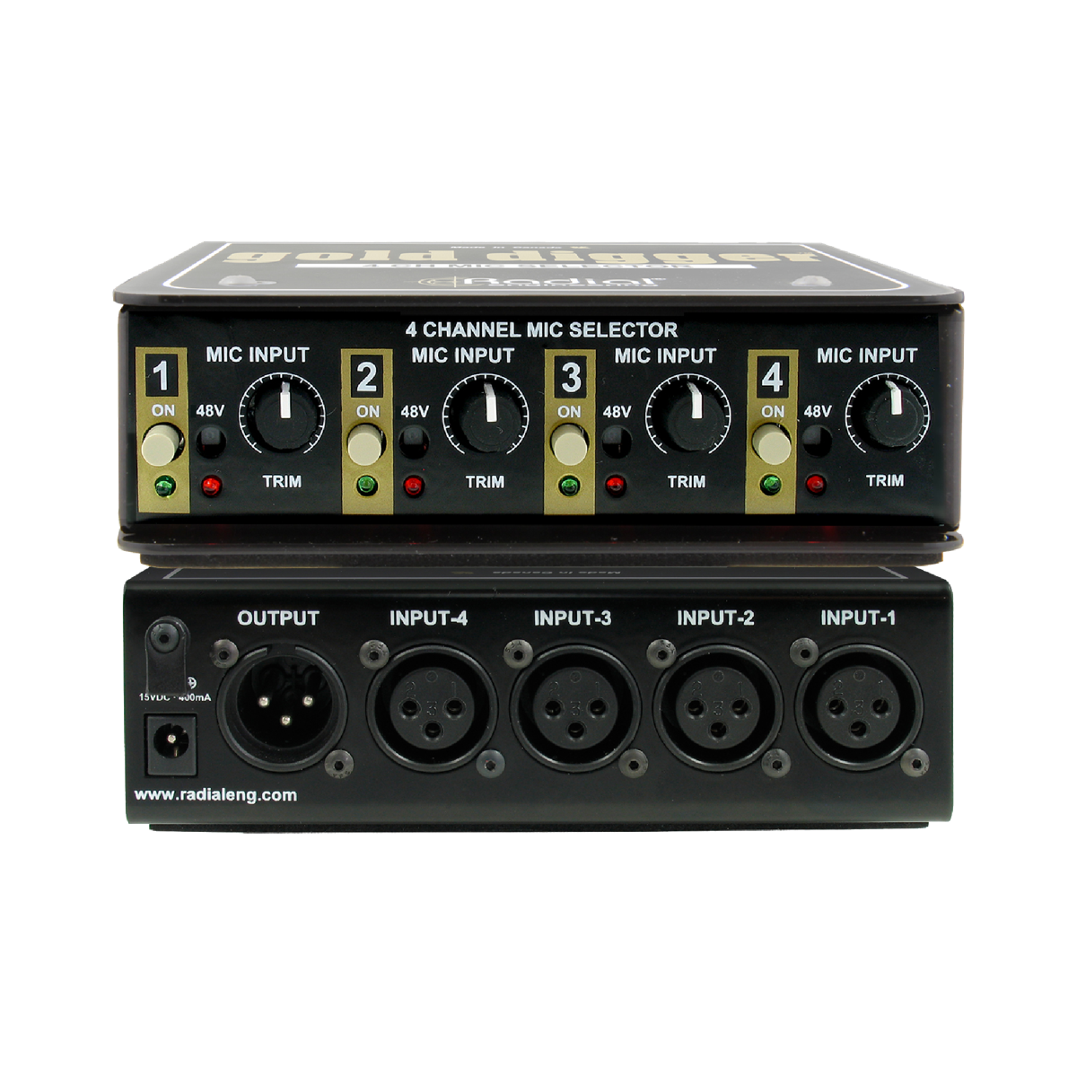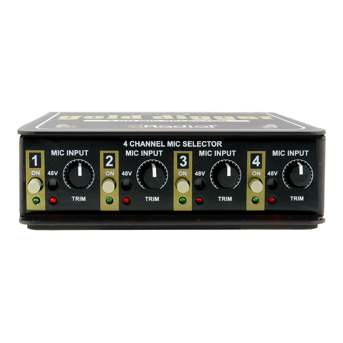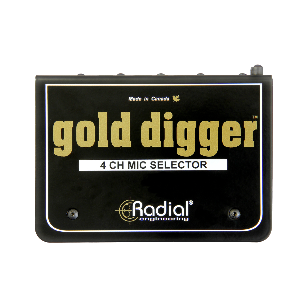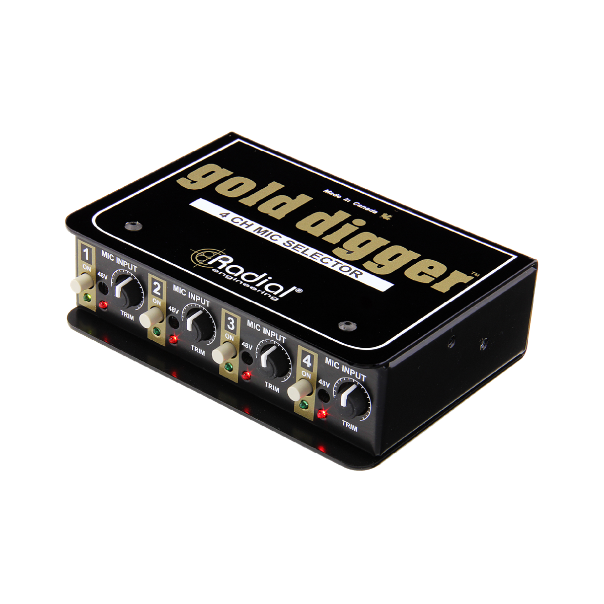 ボタン操作で簡単にマイクを切り替えられ、4つの入力それぞれに個別のトリムコントロールを装備。マイク間で相対的な出力レベルを均一化でき、48Vファンタム電源も供給可能なため、コンデンサーマイクも対応。Gold Diggerを使えば、複数のマイクを効率よく聴き比べながら快適に作業が進められます。Radial Cherry Pickerと組み合わせることで、4つのマイクと4つのプリアンプを自由に組み合わせ、多彩な音響試行を可能にします。