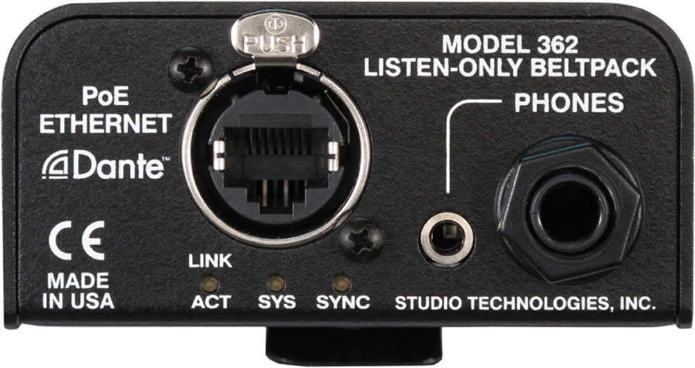 Model362は、DanteRをサポートしているListen専用ベルトパックで、関連した2種類の音声を確認し、チャンネルごとにボリュームコントロールが可能な自己完結型の2チャンネルのオーディオデバイスです。 1人のユーザーが使用することを目的としており、さまざまな現場で威力を発揮することができるサイズ感、機能、そして信頼性を提供します。 ほとんどのアプリケーションは複数のModel362ユニットを使用して、ユーザーグループの個々のオーディオモニタリングをサポートすることができます。(ディップスイッチの設定によってはステレオ仕様で運用することもできます。)