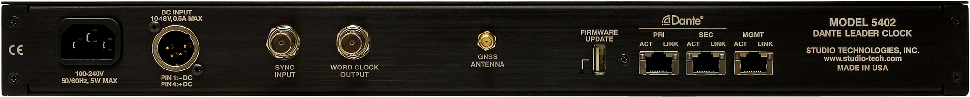 - GNSS (satellite) time-referenced, high-performance Leader clock for Dante audio-over-IP applications. Also supports AES67-2018 applications. In addition, provides audio reference signals (tones) on Dante transmitter (output) channels for general-purpose use and a precision word clock synchronization output.