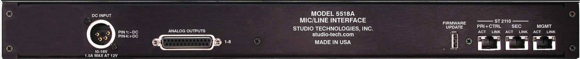 Model 5518A-DC マイク/ラインインターフェースは、SMPTE ST2110規格スイートを活用し、Audio-over-Ethernet(オーディオオーバーイーサネット)ネットワーク接続を実装するアプリケーションとアナログ信号を接続する、シンプルかつ高性能なソリューションを提供します。 冗長ストリームのパフォーマンスは、ST2022-7標準に基づいてサポートされています。8系統のアナログマイクまたはラインレベルの音源を本ユニットに接続し、イーサネットインターフェースを介してデジタルドメインに出力できます。また、イーサネット経由で受信した8系統のデジタルオーディオ信号はアナログに変換され、バランスラインレベル信号として出力されます。 アプリケーションのトラブルシューティングでは、設定を変更することで、正弦波トーンまたはマイク/ライン入力をアナログ出力チャンネルのソースとして選択できます。 モニターセクションでは、メーター機能、ヘッドフォン出力、および必要に応じて2系統のラインレベルアナログ出力を使用し、入力信号と出力信号を選択的にモニタリングできます。